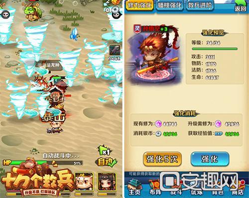 【强化系统】 在救兵界面中,玩家可以选择救兵进行强化,消耗修为和银币可以提升救兵的等级。除了修为,玩家还可以利用得到的各种蟠桃提升救兵的等级。救兵的强化等级最大不能超过玩家。